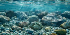 Sun-Dappled Riverbed: A Mosaic of Smooth Stones Glistening Under the Water's Surface