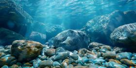 Sun-Dappled Riverbed: A Mosaic of Smooth Stones Glistening Under the Water's Surface