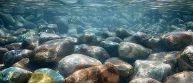 Sun-Dappled Riverbed: A Mosaic of Smooth Stones Glistening Under the Water's Surface