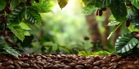 Coffee Plantation Paradise: A Lush Landscape with Ripe Beans and Morning Sunlight