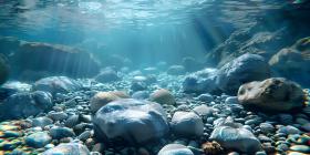 Sun-Dappled Riverbed: A Mosaic of Smooth Stones Glistening Under the Water's Surface