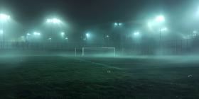 Nighttime Soccer: A Foggy Field Bathed in the Glow of Floodlights