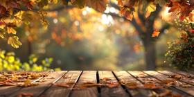 Autumnal Descent: A Rustic Tabletop Scene with Falling Leaves