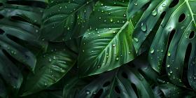 Tropical Dew Drops: A Lush Arrangement of Leafy Greens with Water Droplets