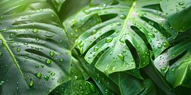 Tropical Dew Drops: A Lush Arrangement of Leafy Greens with Water Droplets