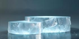 Frozen Stage: A Surreal Ice Platform Amidst a Dreamy Glacial Landscape
