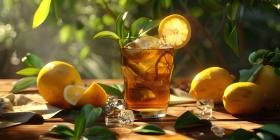 Summer Paradise: A Refreshing Iced Tea with Lemon Slices Under a Sunny Sky