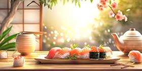 A Rainbow of Flavors: A Vibrant Array of Sushi Rolls, Japanese Cuisine: A Colorful Arrangement of Sushi with a Teapot and Chopsticks