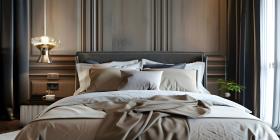 Luxurious Retreat: A Sumptuous Bedroom with Rich Wood Accents and Warm Lighting