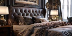 Luxurious Retreat: A Sumptuous Bedroom with Rich Wood Accents and Warm Lighting