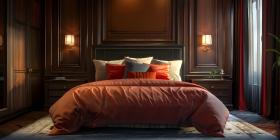 Luxurious Retreat: A Sumptuous Bedroom with Rich Wood Accents and Warm Lighting