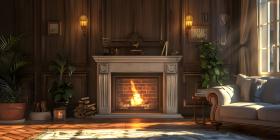 A Sanctuary of Warmth: A Cozy Living Room with a crackling Fireplace and Rich Woodwork