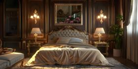 Luxurious Retreat: A Sumptuous Bedroom with Rich Wood Accents and Warm Lighting
