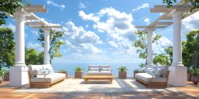 Architectural Design: A Luxurious Terrace with a Pergola and Ocean Views, Outdoor Living Space: A Spacious Patio with Comfortable Seating and Ocean Views