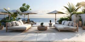 Architectural Design: A Luxurious Terrace with a Pergola and Ocean Views, Outdoor Living Space: A Spacious Patio with Comfortable Seating and Ocean Views