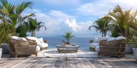Architectural Design: A Luxurious Terrace with a Pergola and Ocean Views, Outdoor Living Space: A Spacious Patio with Comfortable Seating and Ocean Views