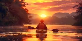 Kayaking at Sunset: Person Paddling on Calm Water with Vibrant Sky and Silhouetted Trees