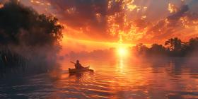 Kayaking at Sunset: Person Paddling on Calm Water with Vibrant Sky and Silhouetted Trees