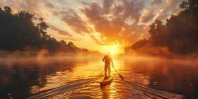 Kayaking at Sunset: Person Paddling on Calm Water with Vibrant Sky and Silhouetted Trees