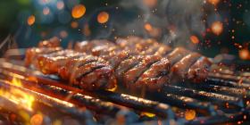 Barbecue Photography: A Close-Up of Skewers Grilling on a Hot Grill, Food Photography: A Grilling Scene with Smoke and Flames