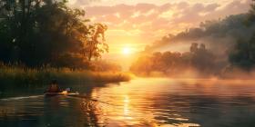 Kayaking at Sunset: Person Paddling on Calm Water with Vibrant Sky and Silhouetted Trees