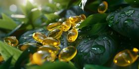 Botanical Supplements: A Close-Up of Omega-3 Capsules on a Bed of Green Leaves, Product Photography: A Still Life of Nutritional Supplements with a Natural Background