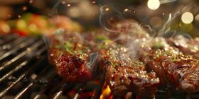 Barbecue Photography: A Close-Up of Skewers Grilling on a Hot Grill, Food Photography: A Grilling Scene with Smoke and Flames