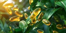 Botanical Supplements: A Close-Up of Omega-3 Capsules on a Bed of Green Leaves, Product Photography: A Still Life of Nutritional Supplements with a Natural Background