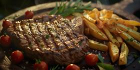 A Sizzling Steak Dinner Fit for a King, A Juicy Steak with Crispy Fries and Fresh Herbs