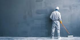 Person Painting an Abstract Wall: Standing on a Protected Floor, Wearing Protective Clothing and Painting a Textured Blue and Gray Wall with a Roller