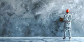 Person Painting an Abstract Wall: Standing on a Protected Floor, Wearing Protective Clothing and Painting a Textured Blue and Gray Wall with a Roller