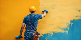 Person Painting an Abstract Wall: Standing on a Protected Floor, Wearing Protective Clothing and Painting a Textured Blue and Gray Wall with a Roller
