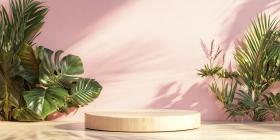 Tropical Display Stage: A Wooden Platform on a Light Floor, Framed by Lush Green Foliage and a Soft Pink Backdrop.