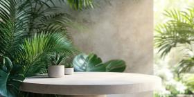Tropical Display Stage: A Wooden Platform on a Light Floor, Framed by Lush Green Foliage and a Soft Pink Backdrop.