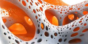 Porous Orange and White Structure: An Abstract 3D Form with Interconnected Holes and Contrasting Colors.